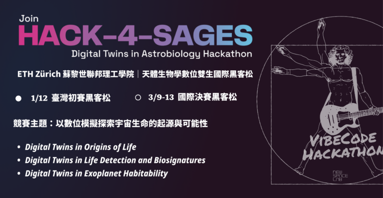 HACK-4-SAGES 由瑞士名校 ETH Zürich 蘇黎世聯邦理工學院發起創新黑客松,聚焦於「天體生物學(Astrobiology)」與「數位雙生(Digital Twins)」的跨域結合,邀集來自天文、行星科學、生物、資訊與工程等不同背景的參與者,運用資料建模、模擬與系統思維,建立可反映真實或假設天體環境的數位模型,探索宇宙中生命的起源、演化與存在條件。